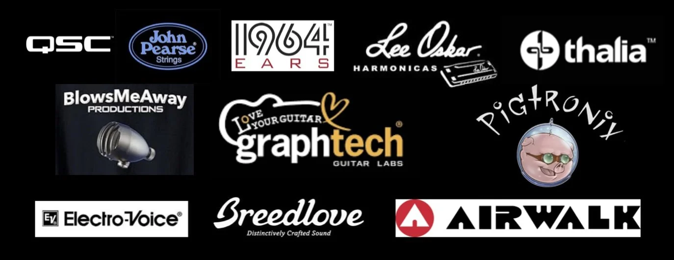 Eric E. is endorsed by Lee Oscar Harmonicas, Breedlove Guitars, QSC Audio, GraphTech, BlowsMeAway Harp Gear, 1964 Ears, Thalia Capos, John Pearse Strings, Electro-Voice, and Airwalk, . He plays a Breedlove C-1 Maple acoustic ( the 108th guitar Breedlove made ) with Sunrise, LR Baggs, & Barcus Berry pickups.,